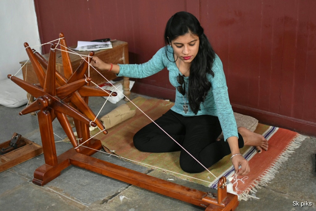 I got really fascinated to see the original Charkha for the first time and couldn’t able to stop myself from trying my hand at it. It was really fun to see how a cotton gets converted to a thread. Magic, I must say!
