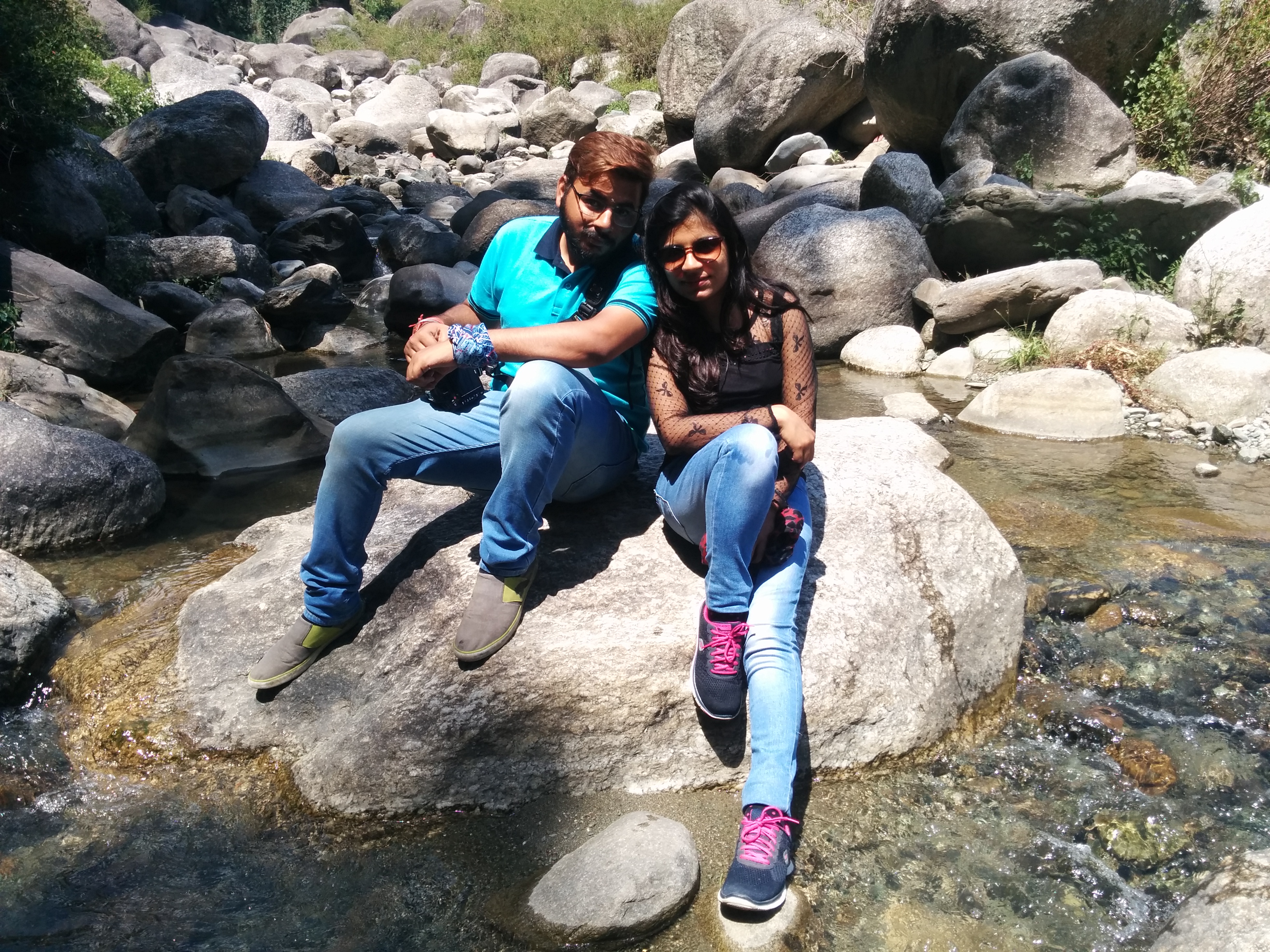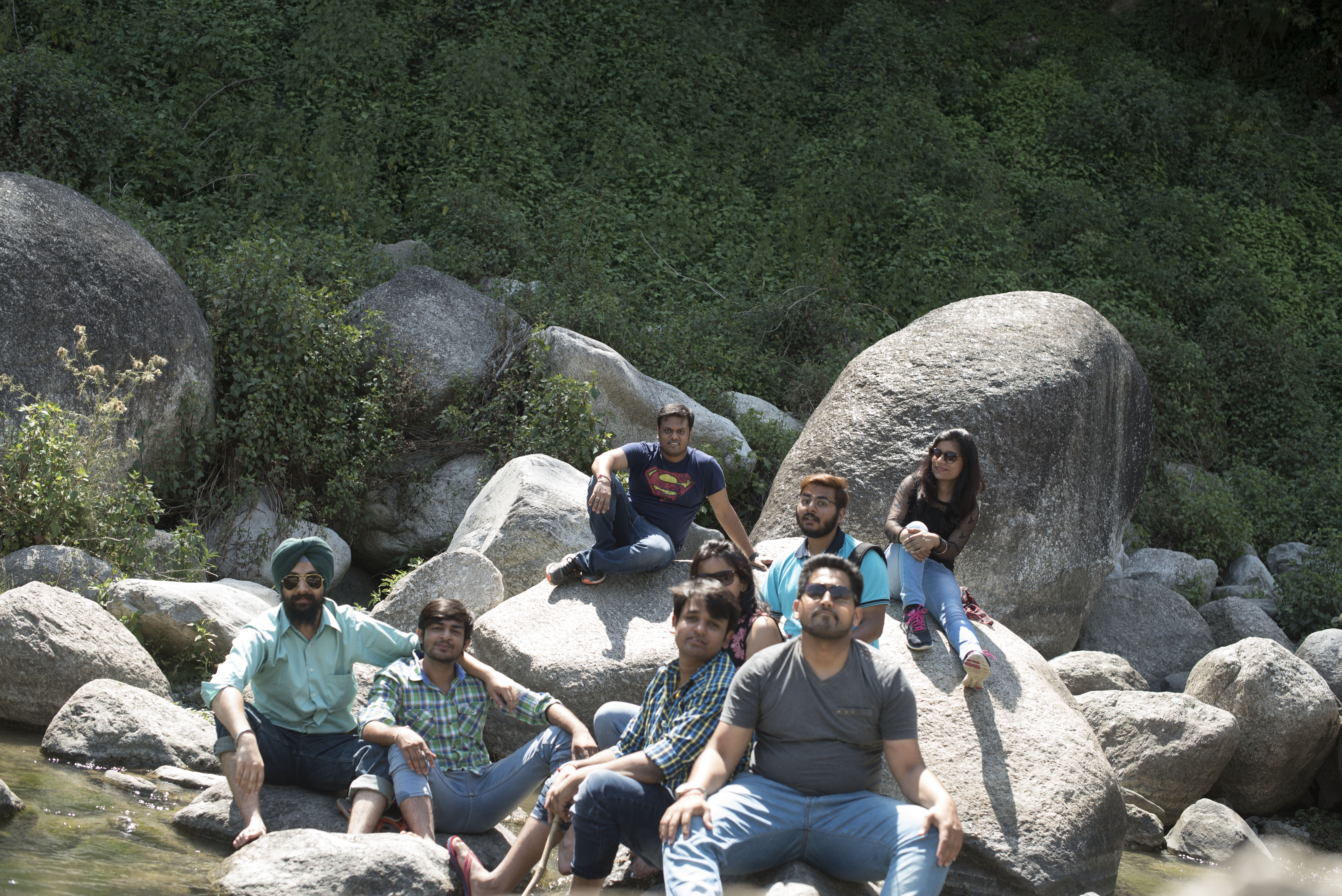 After a while, unluckily, (or maybe luckily, who knows?) one of the tyres of our cab got punctured. There was no spare tyre or a Mechanic to repair the original one. This unexpected delay made us dispirited until but we took it as a possibility to explore the nearby place. We started trekking downhill and after walking for some time, what we saw had proved our luck again; it was the water stream flowing over the rocks with lush green vegetation around it. We started fording the stream to reach the far end. In a moment, I don’t know who started it, we all got drenched with splashes of water. Sunlight sieving through the clouds set our mood to click pictures and loads of it. And then amidst this fun, we got a call from a driver that “Dhano is ready to move now”. And I wished if I could stop this time!