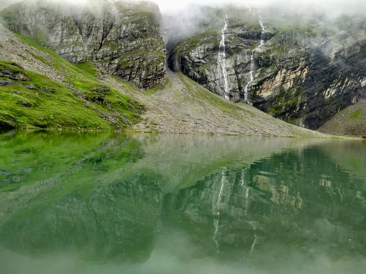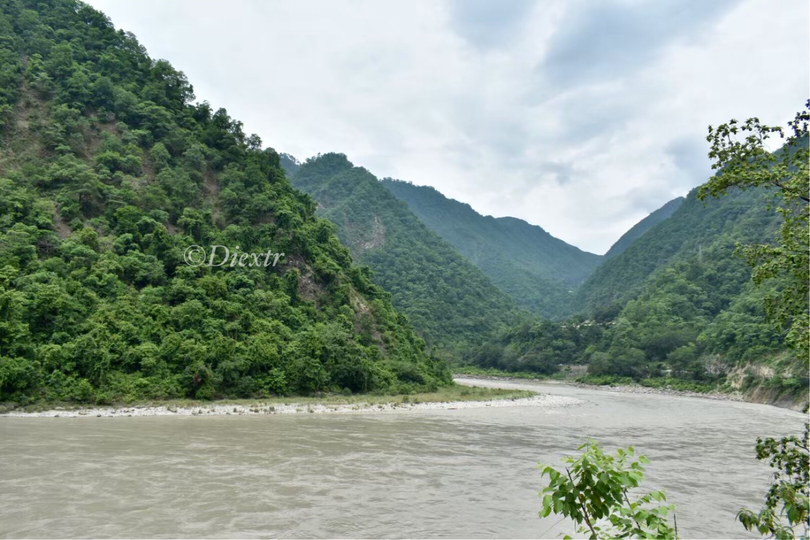 Whereupon, I could see on my left the range of black mountains drenched in morning dew and rain, covered in green velvety grass. To my right another mountain range, looking down to our diminutive figures. In between flowed the river- madly, fearlessly, curving with each turn of the mountain.